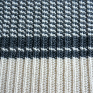 寄せ柄で目を斜めにした箇所と真っ直ぐの箇所を組み合わせたボーダー編地です