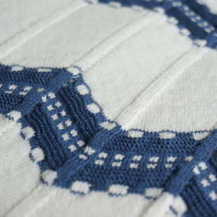 ボーダー箇所は右曲がりと左曲がりする斜行糸をそれぞれ使用する事で相殺させ真っ直ぐに編んでいます。