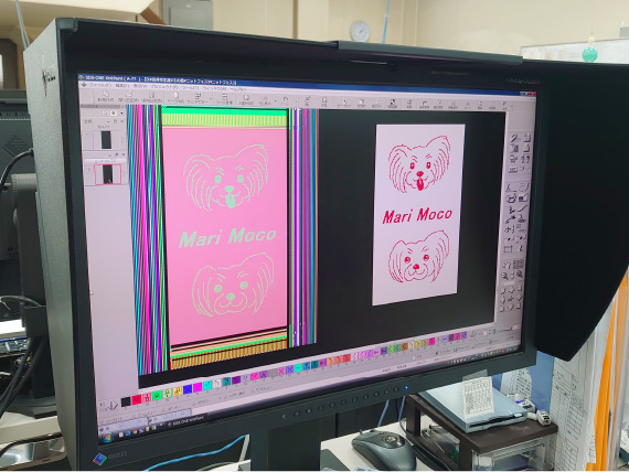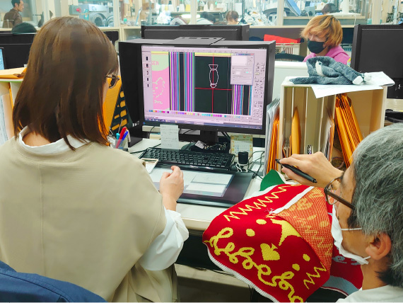 デザインシステムを使って自由に柄をデザインして、糸の色を選んでジャガード編みします。