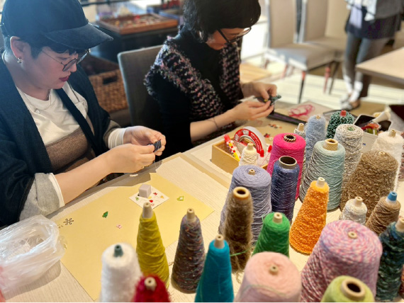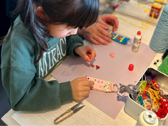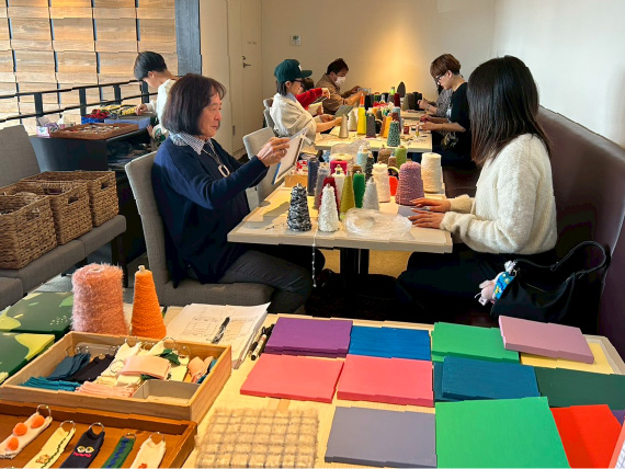 残糸・残反を使ってオリジナルの「ニットキーホルダー」や「アートボード」を作るワークショップは、手を動かす楽しみにあふれています。