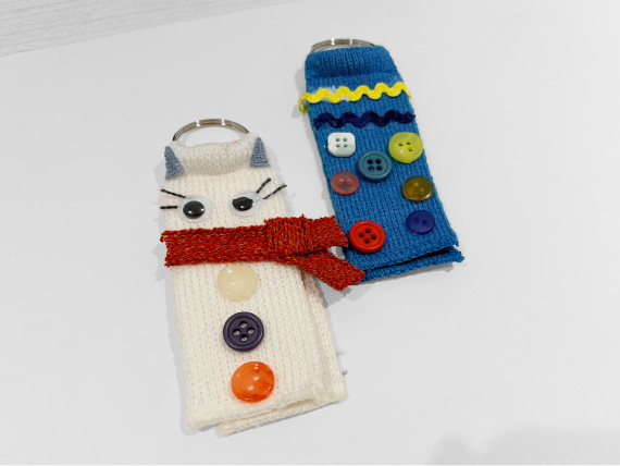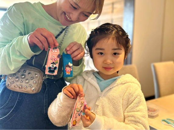 キーホルダー作りは、糸やモチーフを縫いつけたり、ボンドで貼ったり。思わず誰もが熱中してしまいます。