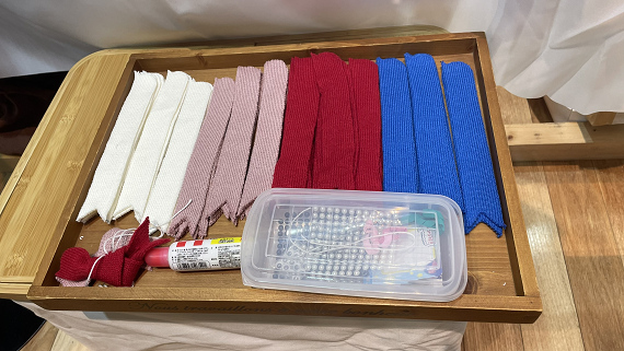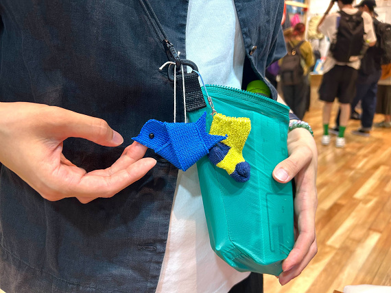 また、今回は小鳥をつくるワークショップも開催しました。残反のリボンをひと結びするだけで小鳥の形ができあがり。目はシールで貼り付け、最後に「ベラ針」というニット生産に欠かせない特殊な針を使ってヒモをつけて仕上げます。