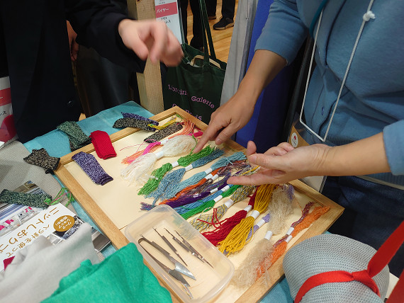 また、来場者の方にご参加いただけるワークショップも開催。残反や残糸でしおりをつくるベラ針体験をしていただきました!