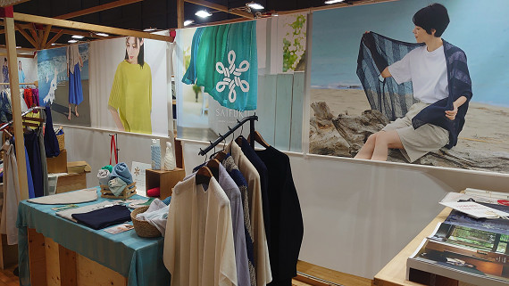 今回は春夏展示ということもあり、ブース全体を軽やかな空気感で包むことを意識しました。台にはSAIFUKUの夏の定番「透けるボーダー」を敷き、風を感じるような涼やかな空間を演出。商品の透け感ともリンクさせながら、春夏らしい世界観を表現しました。
