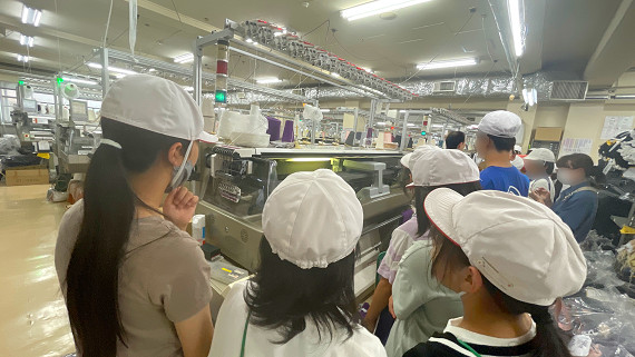 その後はいよいよ工場見学へ。実際に動いているニットの編み機を間近で見学していただきました。
